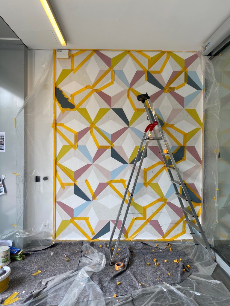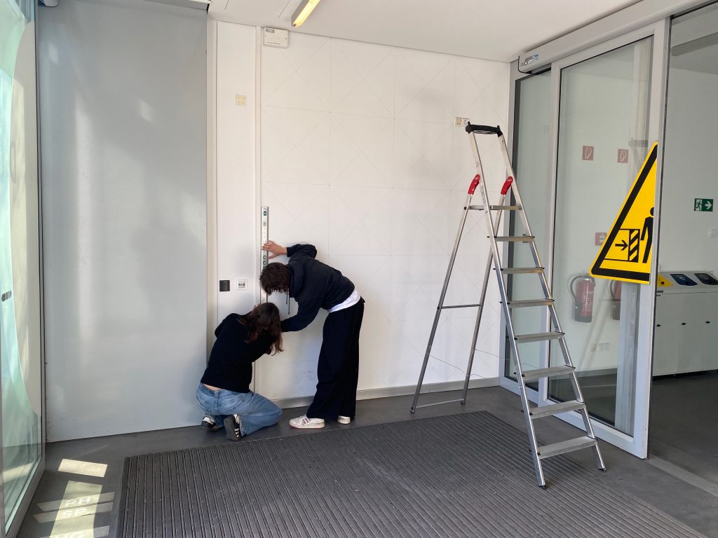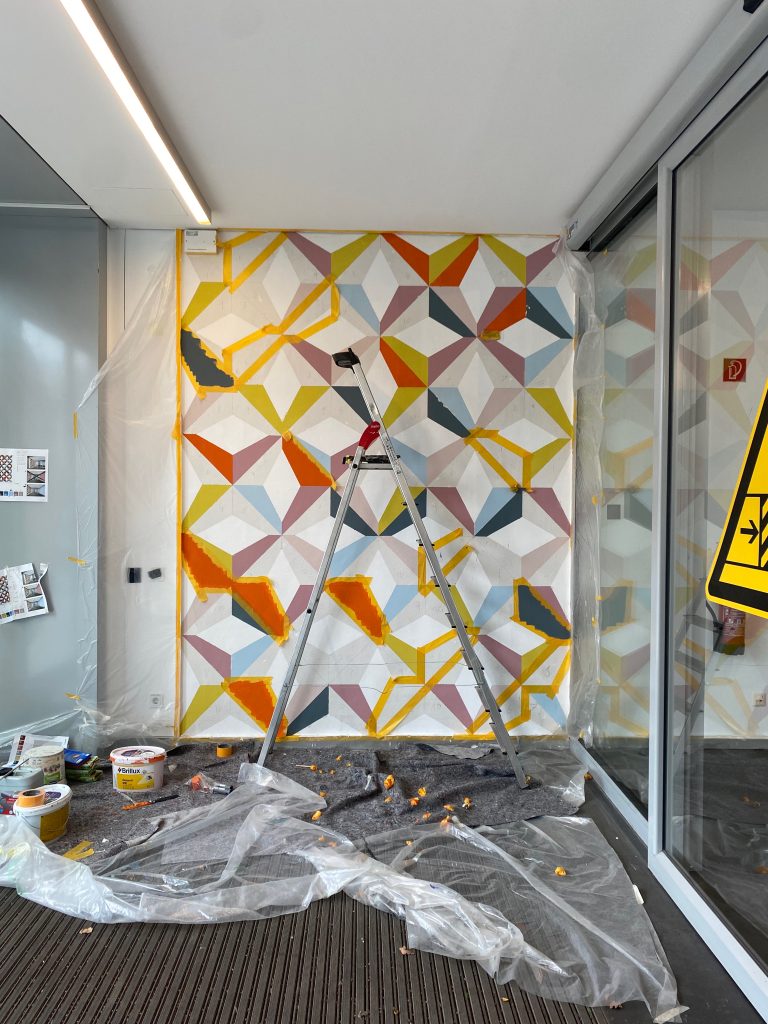 Over the past three weeks, the entrance area of our building has undergone a stunning transformation, thanks to Laila, Malou, and Nele—the three participants of my class “Walls Walls Walls” who won the internal competition.