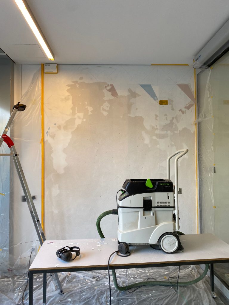 The road to the finished mural wasn’t without its hurdles. During the initial phase, we encountered technical difficulties with the wall surface. It became clear that the existing surface was not suitable for taping and had to be sanded down completely. This unexpected step required an extra couple of days, but it ensured a much cleaner finishing as well as longevity of the artwork.