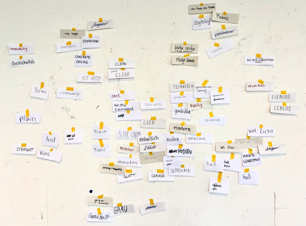 In a brainstorming the class described the current impression of the building: cool, grey, modern, clean, plain, light, undefined, empty, technical. In a second brainstorming they defined what kind of atmosphere they would rather encourage in the building they spend four years studying design at: meaningful, creative, inspiring, inviting, eye-catching.