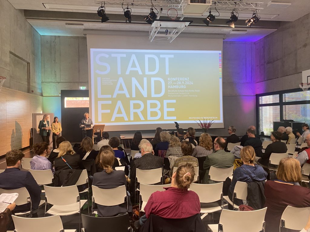 Every two years, Deutsche Farbenzentrum (German color center) organizes a conference in Germany featuring a specific color related topic. Having already received crucial inspiration for my master’s thesis at the 2023 “Color and Health” conference, this year’s conference titled “Stadt Land Farbe” (“City, Country, Color”) coincided perfectly with my thesis writing period. The conference primarily addressed color in built, spatial contexts, including site-specific color schemes, architectural studios specializing in color, painting and craft topics, as well as artistic projects in public spaces. Again, the question of color education resurfaced frequently, highlighting its role in the often-hesitant use of color in architecture and design.