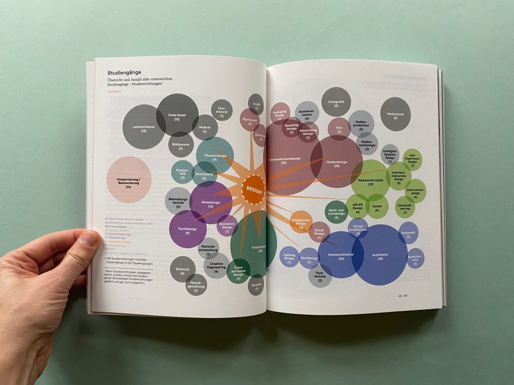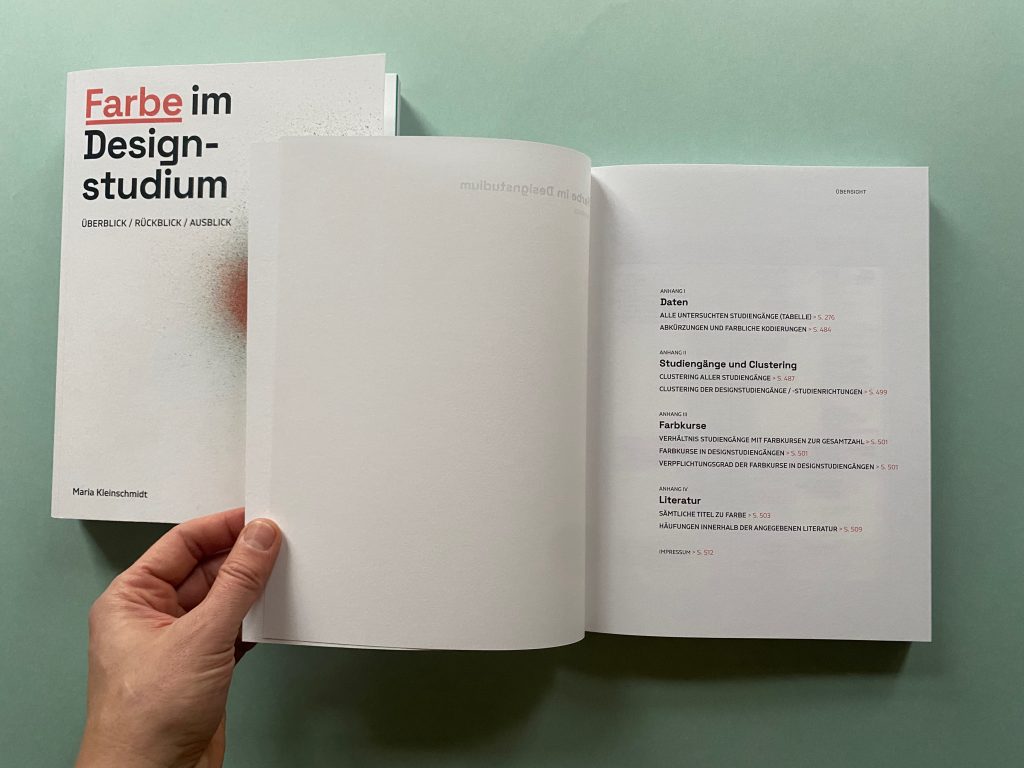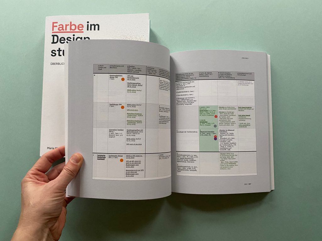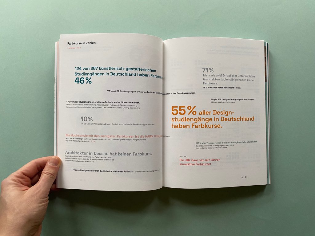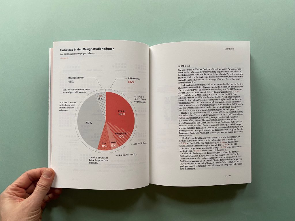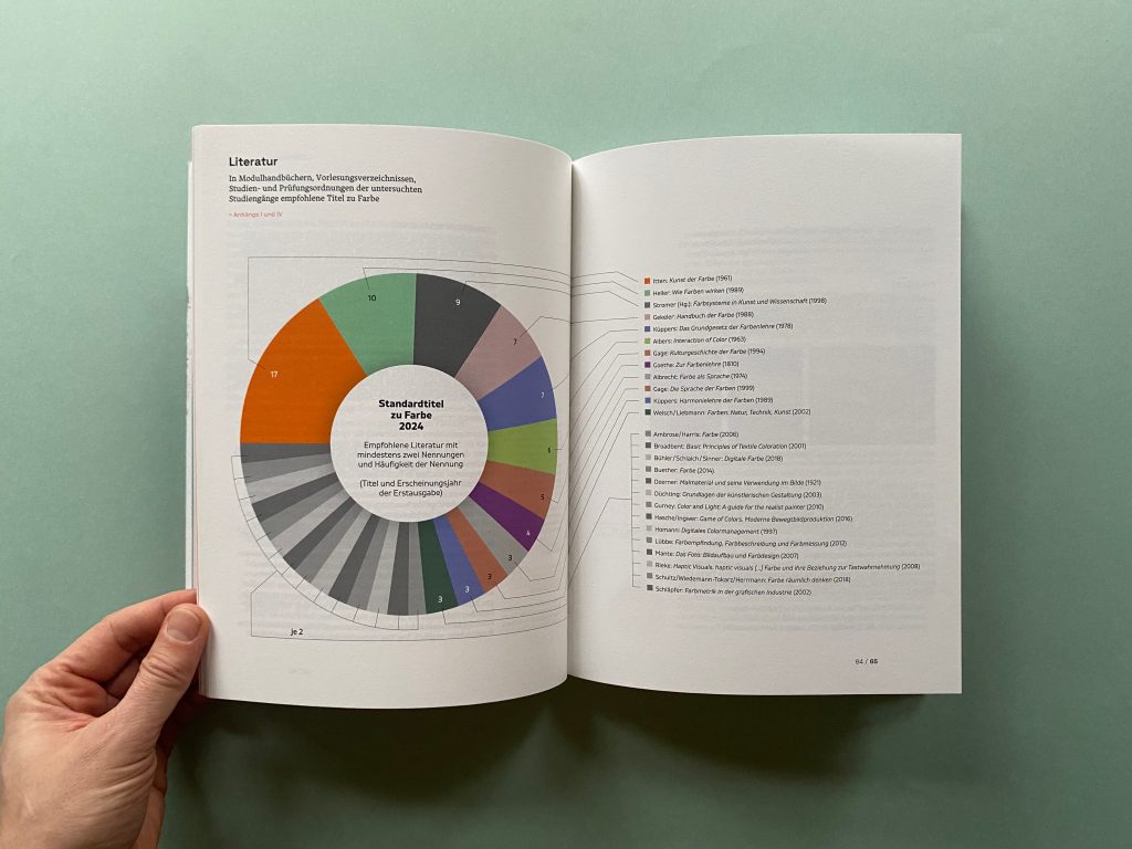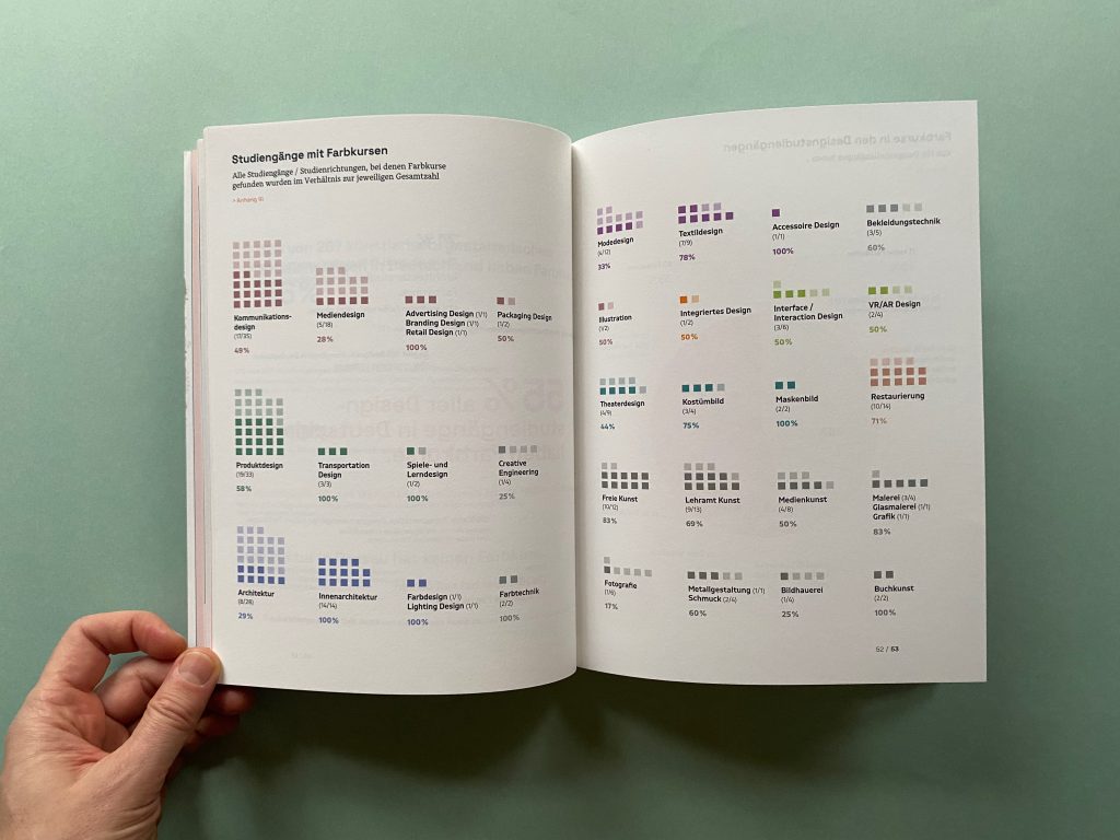 The first part collects data on how the subject of color is currently taught in design courses at public universities and art schools throughout Germany. Module handbooks, course plans, study and examination regulations, websites of the universities and the courses as well as lecture lists are scanned for keywords on color and evaluated. In addition to design courses, the courses examined also include architecture, interior design, fine arts, art education, and restoration.