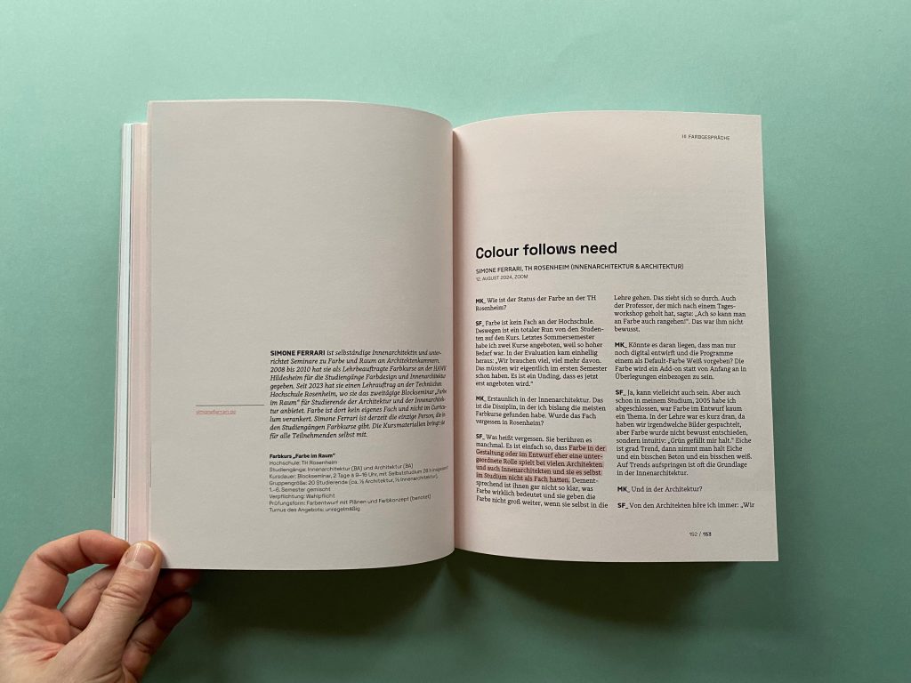 On a personal level, this master’s thesis served to update and enrich my own color teaching. Closely linked to this was, and remains, the desire to dispel my students‘ apprehension about color. The research, the exchange with other color educators, and the events organized by DFZ proved exceptionally fruitful.